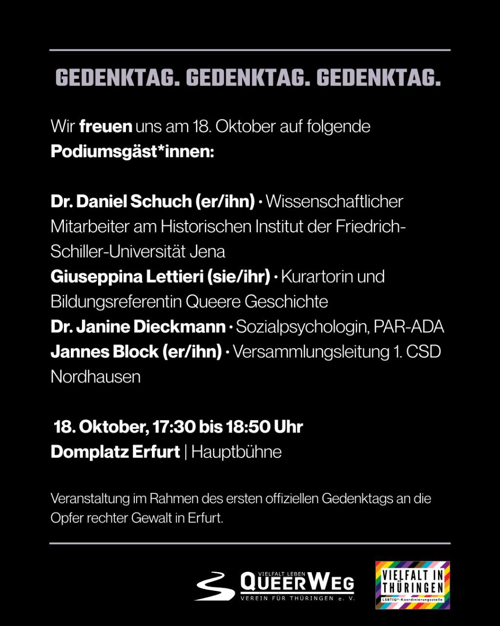 Am Samstag, den 18. Oktober 2025 findet der Gedenktag für die Opfer rechter Gewalt auf dem Domplatz in Erfur statt. Organisiert wird der Gedenktag von Blinde Flecken e. V.