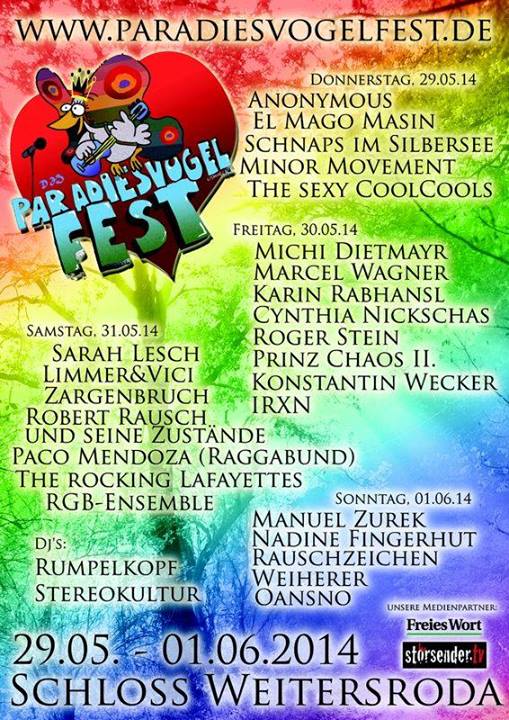 Wir haben uns richtig in´s Zeug gelgegt, um 2014 ein tolles LineUp für euch auf die Beine zu stellen. Über 25 Act´s, Liedermacher, Bands, Kabarettisten und DJ´s geben sich auf der Paraiesvogel-Bühne vier Tage lang die Klinke in die Hand! Das alles im wunderbaren Ambiente unserer becheidenen Wohnstätte "Schloß Weitersroda". Für euer leibliches Wohl wird der Pizza-T.A.N.K. aus Berlin sorgen während sich Kenner und Freunde schon auf "Hogels (sehr) mächtige Absyntbar" und die Nächte in unserer Schloßkneipe "Simplicissimus" freuen.